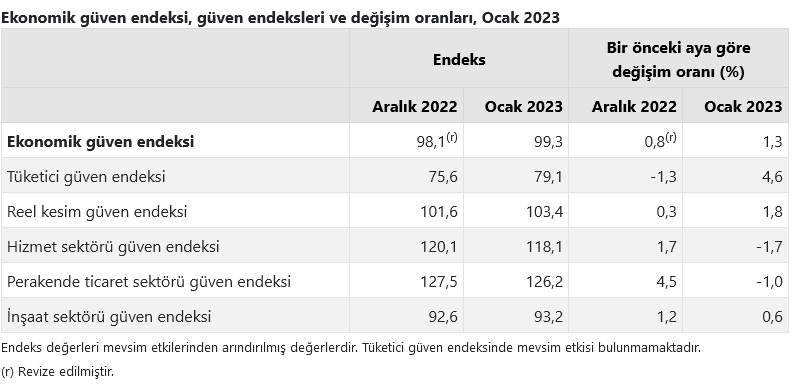 Ekonomik güven endeksi 2022 Aralık ayında 98,1 iken, 2023 Ocak ayında yüzde 1,3 oranında artarak 99,3 değerini aldı.