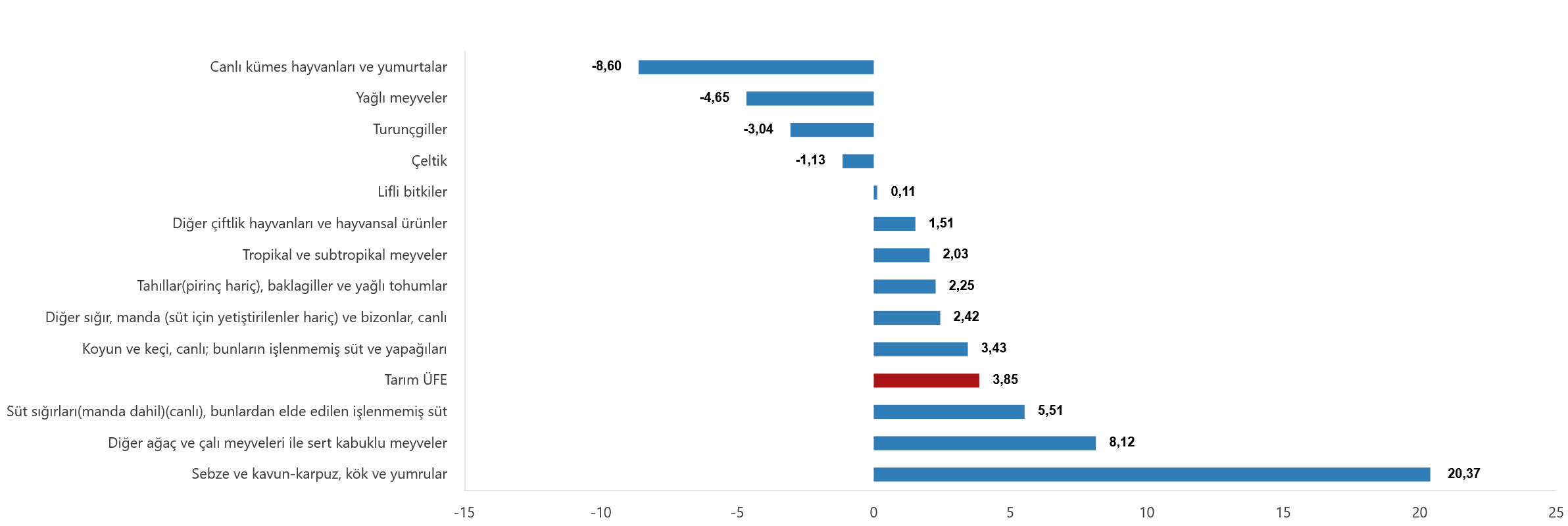 Sektörler bazında bakıldığında, tarım ve avcılık ürünleri ile ilgili hizmetlerde bir önceki aya göre %4,06 artış yaşandı. Ana gruplarda ise tek yıllık (uzun ömürlü olmayan) bitkisel ürünlerde aylık %12,21 gibi sert bir yükseliş görülürken; canlı hayvanlar ve hayvansal ürünler grubu da %3,30 artışla bu yükselişe eşlik etti. Balıkçılık ürünlerinde ise aylık bazda %0,10’luk sınırlı bir düşüş kaydedildi.