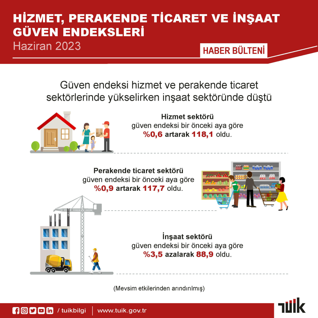Buna göre mevsim etkilerinden arındırılmış güven endeksinin Haziran ayında bir önceki aya göre; hizmet sektöründe yüzde 0,6 ve perakende ticaret sektöründe yüzde 0,9 artarken inşaat sektöründe yüzde 3,5 azaldığını açıkladı.